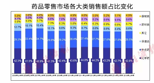 根據(jù)CFDA南方所廣州標點醫(yī)藥信息有限公司中國藥品零售系統(tǒng)監(jiān)測數(shù)據(jù)顯示,2015年上半年藥品零售市場化學藥、中成藥和保健品的銷售額占比分別為42.8%、28.5%和8.6%,化學藥銷售額占比與2014年同期相比上升0.1個百分點,中成藥上升0.7個百分點,保健品上升0.2個百分點,藥材類下降0.9個百分點,器械類下降0.2個百分點。從藥品零售市場各大類銷售額占比變化圖上看到,藥材類銷售額占比下滑較為明顯,中成藥類產(chǎn)品有所提升。