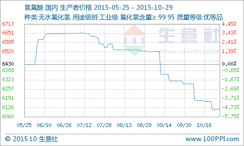 十月份氫氟酸市場(chǎng)迎來(lái)一波下跌,表現(xiàn)突出的是南方地區(qū)無(wú)水氫氟酸市場(chǎng),平均下跌200-400元/噸,北方市場(chǎng)成本控制價(jià)格變動(dòng)不大但成交寥寥,市場(chǎng)比較蕭條。目前整體價(jià)格區(qū)間在5500-6800元/噸,主流成交多在5700-6000元/噸,江西地區(qū)廠家出廠價(jià)5500-6200元/噸;山東地區(qū)主流送到價(jià)格在6400-7000元/噸;浙江地區(qū)主流送到價(jià)格為5800-6000元/噸,行業(yè)受環(huán)保影響較大,開(kāi)工率維持在5-6成。