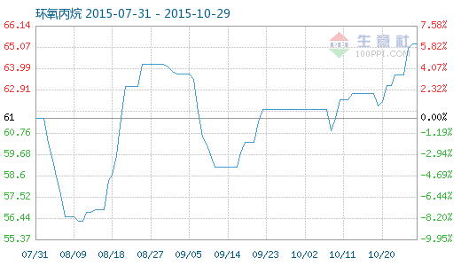 10月28日環(huán)氧丙烷商品指數(shù)為65.25,與昨日持平,較周期內(nèi)最高點(diǎn)101.18點(diǎn)(2011-10-26)下降了35.51%,較2015年08月11日最低點(diǎn)56.27點(diǎn)上漲了15.96%。(注:周期指2011-09-01至今)