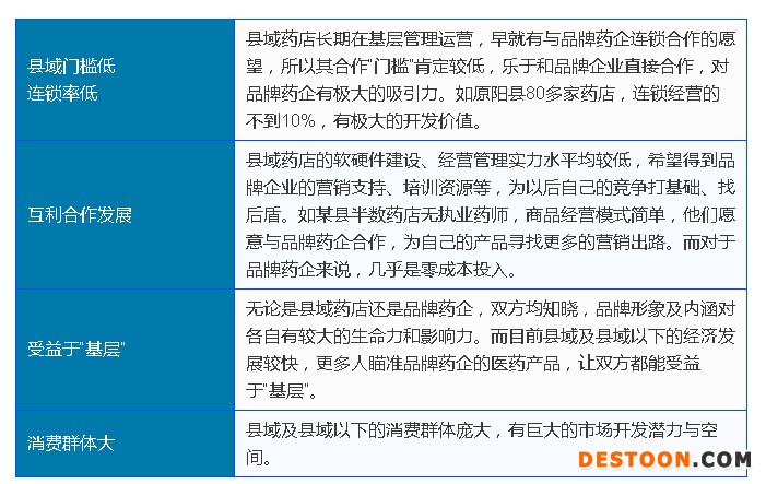 目前,連鎖經營在大城市已普及展開,很少有新的開發(fā)對象,品牌藥企自然要將連鎖的目標轉向縣域藥店。而品牌藥企下沉也正是國家“供給側結構性調整”精神的表現(xiàn),可以說是大勢所趨,符合國家政策與現(xiàn)行經濟規(guī)則,也是基層所需,有極大的發(fā)展空間。國家已經準備好了“魚塘”,縣域藥店萬萬不可做姜太公,要主動出擊,在軟硬件等方面做出努力,才能收獲品牌藥企下沉的資源。