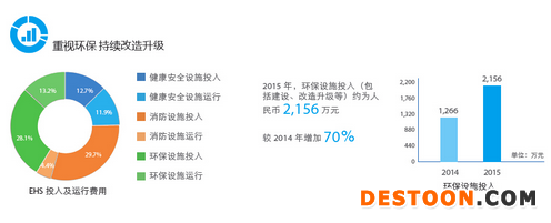 在EHS方面,重視環(huán)保,持續(xù)升級(jí)改造,2015年環(huán)保設(shè)施投入2156萬(wàn)元,較2014 年增加70%;更有效利用水資源,總循環(huán)用水量為2014年的6.38 倍;職業(yè)健康安全硬件投入與運(yùn)營(yíng)總費(fèi)用4505萬(wàn)元,是2014年的2倍,同時(shí)EHS培訓(xùn)總時(shí)長(zhǎng)超過(guò)7萬(wàn)小時(shí)。
