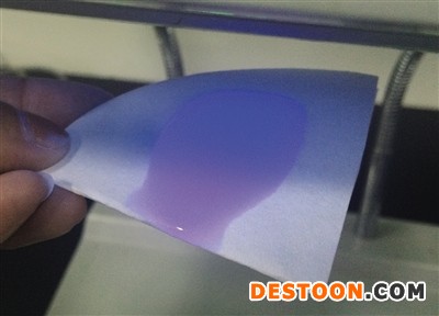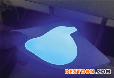 紫外儀下,奧妙洗衣液樣品發(fā)出明顯的藍色亮光。