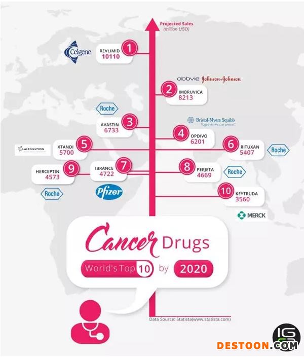 幸運的是,許多制藥和生物技術(shù)公司都關(guān)注到了這一需要。Statista 2016年的一份統(tǒng)計報告預(yù)測了2020年全球十大抗癌藥,排名依據(jù)是藥物帶來的收益,具體如下: