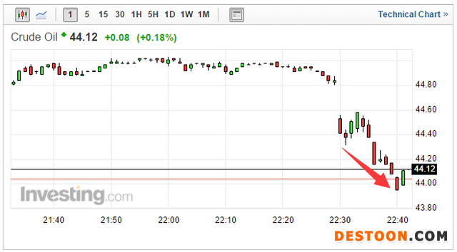 整體看,上周(4.18-22)EIA庫存高于預期。數據公布后,油價漲幅大幅收窄。WTI 6月原油期貨完全回吐日內稍早超過2%的漲幅,并失守44美元/桶關口,一度交投于43.95美元/桶。下圖為美油走勢:
