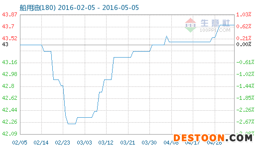 5月5日船用油(180)商品指數(shù)為43.73,與昨日持平,較周期內(nèi)最高點(diǎn)104.84點(diǎn)(2013-03-12)下降了58.29%,較2016年02月28日最低點(diǎn)42.24點(diǎn)上漲了3.53%。(注:周期指2012-09-01至今)