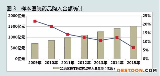 據(jù)中國醫(yī)藥工業(yè)信息中心PDB數(shù)據(jù)庫統(tǒng)計,2015年22城市樣本醫(yī)院藥品購入金額同比增長為6.58%,比去年同期下降5個百分點。