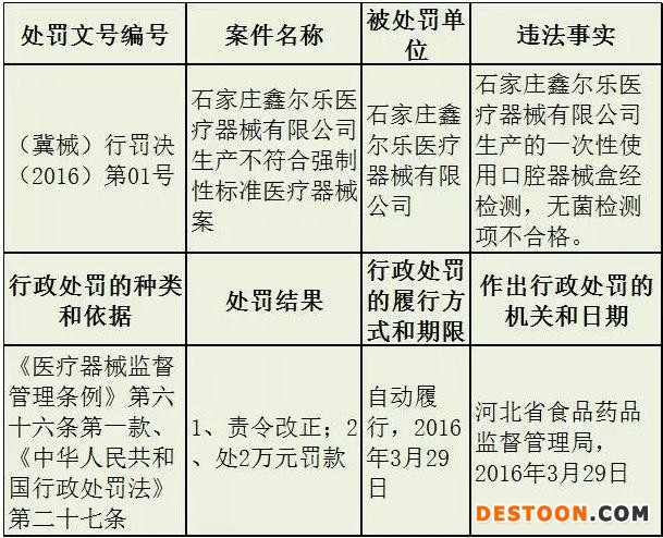 5月13日,河北省藥監(jiān)局網站發(fā)布《河北省食品藥品監(jiān)督管理局2016年行政處罰案件信息公開表(第二批)》,其中有一家醫(yī)療器械公司因生產不符合強制性標準的醫(yī)療器械被處罰。