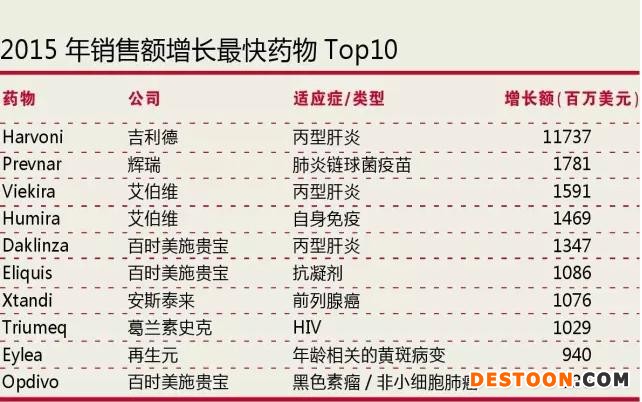 2015年全球銷售額增長最快的前50種藥物合計比去年增長410億美元。僅吉利德(Gilead)的丙肝藥物Harvoni帶來的增長額就高達117億美元,占總增長額的29%。