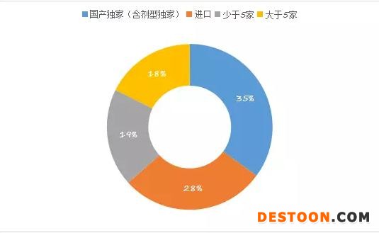 筆者粗略統(tǒng)計(jì)了一下該城市2015年全部醫(yī)保、基藥產(chǎn)品的銷售情況,按照進(jìn)口、國(guó)產(chǎn)獨(dú)家、國(guó)產(chǎn)少?gòu)S家、及普藥等不同類型藥物的銷售比例如下圖。