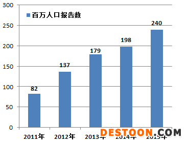 圖1-3 2011-2015年全國(guó)每百萬(wàn)人口平均報(bào)告數(shù)比較