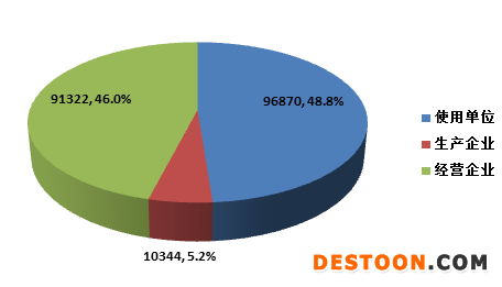 截止2015年12月31日,在全國(guó)醫(yī)療器械不良事件監(jiān)測(cè)系統(tǒng)中,注冊(cè)基層用戶(包括醫(yī)療器械生產(chǎn)企業(yè)、經(jīng)營(yíng)企業(yè)和使用單位)共198, 536家。其中,醫(yī)療器械生產(chǎn)企業(yè)10,344家,占注冊(cè)基層用戶總數(shù)的5.2%;經(jīng)營(yíng)企業(yè)91,322家,占注冊(cè)基層用戶的46.0%;使用單位96,870家,占注冊(cè)基層用戶的48.8%(圖1-4)。