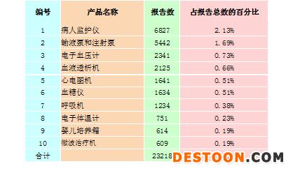 表2-3 報(bào)告數(shù)量排名前十位的有源醫(yī)療器械