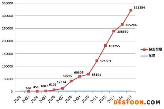 圖1-1 2002-2015年全國(guó)可疑醫(yī)療器械不良事件報(bào)告數(shù)量