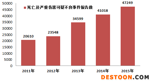 圖1-2 2011-2015年全國(guó)死亡及嚴(yán)重傷害可疑不良事件報(bào)告數(shù)比較