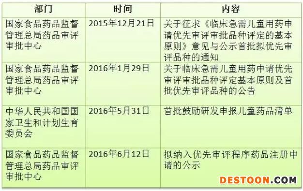 截至2016年6月12日,CFDA藥品審評(píng)審批中心(CDE)網(wǎng)站共公布了2次擬優(yōu)先審評(píng)品種名單,1次正式名單;國(guó)家衛(wèi)計(jì)委公布了1次首批鼓勵(lì)研發(fā)申報(bào)兒童藥品清單。