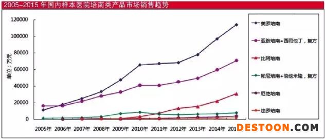 從全球培南類(lèi)TOP 3產(chǎn)品銷(xiāo)售情況來(lái)看,美羅培南2005年銷(xiāo)售額為7.2億美元,2008年最高達(dá)到10.5億美元,2014年僅為4.6億美元,同比下降6.2%;復(fù)方亞胺培南/西司他丁2005年銷(xiāo)售額為7.4億美元,2007-2008年銷(xiāo)售額在7.6億美元左右,2014年僅為3.3億美元,同比下降1.8%;厄他培南2005年銷(xiāo)售額為0.94億美元,2014年上升為5.3億美元,同比增長(zhǎng)8.4%。厄他培南是TOP3產(chǎn)品中銷(xiāo)售額唯一增長(zhǎng)的產(chǎn)品。