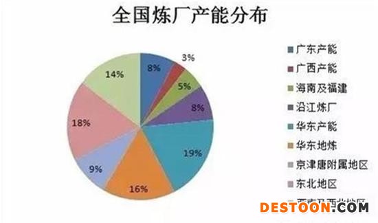 煉廠的地理分布與中國的經(jīng)濟(jì)發(fā)展水平亦大體一致。其中華東煉廠的產(chǎn)能約占全國產(chǎn)能的35%左右,華南煉廠為16%左右,東北煉廠為18%左右。華南煉廠的產(chǎn)能相對(duì)經(jīng)濟(jì)發(fā)展水平略低,而東北煉廠的產(chǎn)能相對(duì)經(jīng)濟(jì)發(fā)展水平略高。因此,中國煉廠的區(qū)域相對(duì)不均衡導(dǎo)致了在油品消費(fèi)高峰期,大量的北方油品南下,為了緩解此類情況,中國煉廠也在華南區(qū)域大量投資新建煉廠,以緩解此類矛盾。