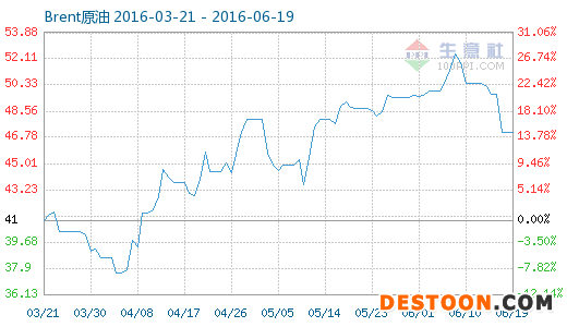 6月19日Brent原油商品指數(shù)為47.10,與昨日持平,較周期內(nèi)最高點(diǎn)100.00點(diǎn)(2014-09-09)下降了52.90%,較2016年01月21日最低點(diǎn)27.82點(diǎn)上漲了69.30%。(注:周期指2014-09-09至今)