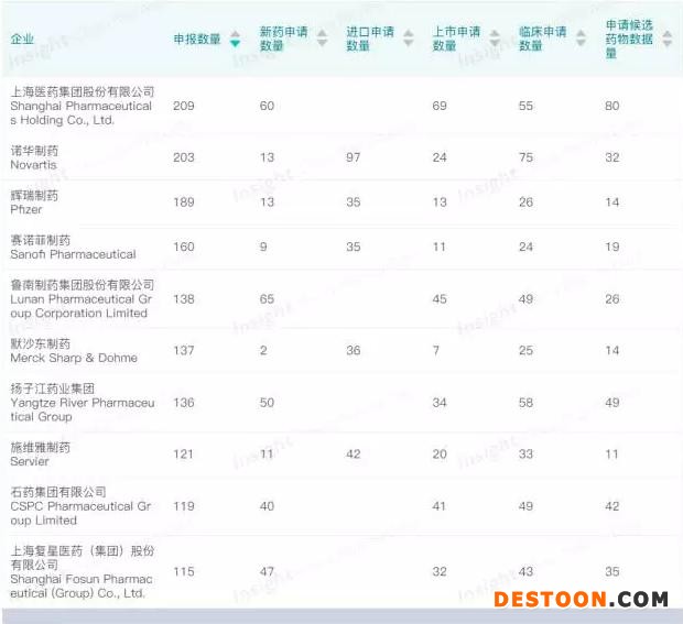 從受理號申報數(shù)量來看,上海醫(yī)藥奪得 TOP 1。諾華、輝瑞、賽諾菲三巨頭緊跟其后。魯南、揚(yáng)子江、石藥和復(fù)星,也進(jìn)入了 TOP 10。