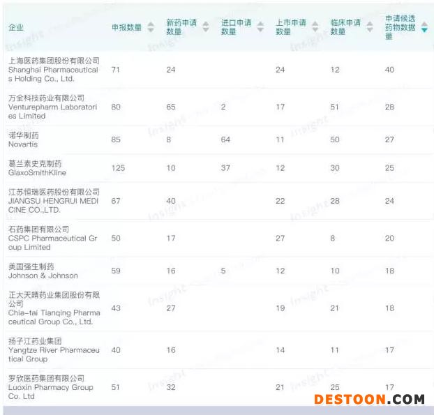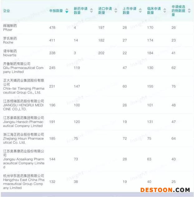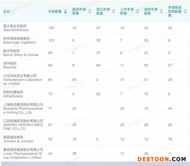 即使從申報藥物品種數(shù)量角度來看,諾華、GSK 和強(qiáng)生也不甘落后,依然挺進(jìn)前十。