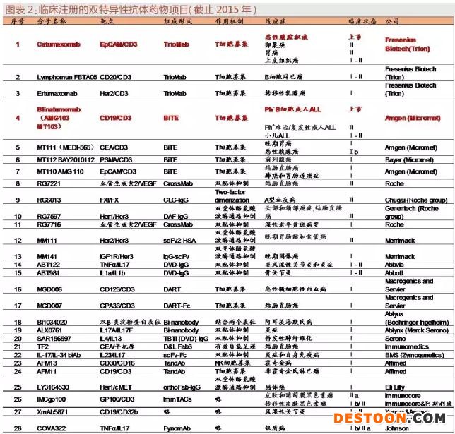 在新型抗體藥物研發(fā)中,雙特異性抗體是目前最為令人矚目的方向,多個制藥公司投資研發(fā)雙特異性抗體藥物,臨床試驗不斷增加。筆者統(tǒng)計了截止2015年雙特異性抗體藥物的臨床項目發(fā)現(xiàn),目前有25個在臨床試驗階段的雙特異性抗體,其中Catumaxomab和Blinatumomab已經(jīng)上市,另外包括已上市產(chǎn)品在內(nèi)的9個產(chǎn)品的12個適應癥處于臨床Ⅱ期試驗狀態(tài)。