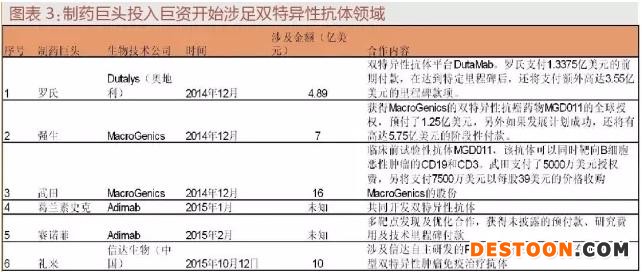 雙特異性抗體領域參與公司名單赫然包括安進(Amgen)、羅氏(Roche)、阿斯利康、賽諾菲、強生和禮來(Eli Lilly)等制藥巨頭。2014年起,強生、羅氏、賽諾菲等公司通過收購創(chuàng)新型生物公司及產(chǎn)品管線和創(chuàng)新型公司合作不斷加碼雙特異性抗體領域,目前總投資額接近40億美元,充分表明制藥巨頭們看好雙特異性抗體領域的發(fā)展前景和潛在價值。
