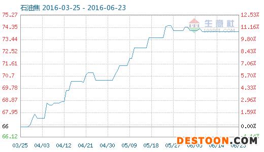 6月23日石油焦商品指數(shù)為74.04,與昨日持平,較周期內最高點108.79點(2013-04-15)下降了31.94%,較2016年03月28日最低點66.89點上漲了10.69%。(注:周期指2012-09-30至今)