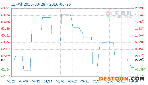 6月27日二甲醚商品指數(shù)為62.40,與昨日持平,較周期內(nèi)最高點(diǎn)115.59點(diǎn)(2013-12-15)下降了46.02%,較2016年02月26日最低點(diǎn)60.78點(diǎn)上漲了2.67%。(注:周期指2011-09-01至今)