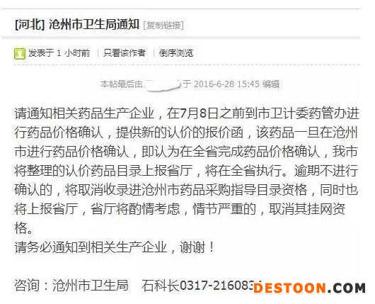 6月28日,一份河北滄州市衛(wèi)生局確認(rèn)調(diào)價(jià)的文件,在醫(yī)藥行業(yè)論壇和微信群引起了騷動(dòng)。筆者查詢滄州衛(wèi)生局并未公開此文件,但有知情人士表示,有人給滄州衛(wèi)生局打過電話,說真有此事。通知內(nèi)容如下: