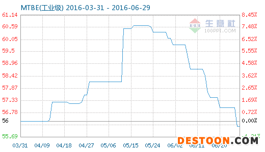 6月29日MTBE(工業(yè)級(jí))商品指數(shù)為56.11,較昨日下降了0.04點(diǎn),較周期內(nèi)最高點(diǎn)109.29點(diǎn)(2012-03-29)下降了48.66%,較2016年01月31日最低點(diǎn)51.79點(diǎn)上漲了8.34%。(注:周期指2011-09-01至今)