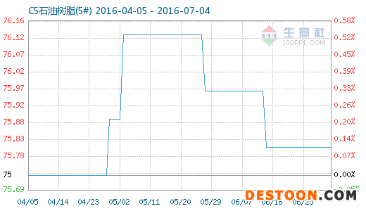 7月3日C5石油樹脂(5#)商品指數(shù)為75.81,與昨日持平,較周期內(nèi)最高點114.19點(2013-11-25)下降了33.61%,較2016年03月14日最低點75.00點上漲了1.08%。(注:周期指2012-06-01至今)