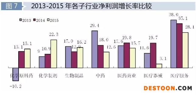 近三年各子行業(yè)凈利潤增長率情況顯示,2015年醫(yī)療服務凈利增長率提高最大,達到28.1%,但2013年以來凈利增長率不斷下降?;瘜W原料藥從2013年呈現(xiàn)負增長恢復到2015年的15.1%,化學制劑2015年的凈利率增長較2014年有較大幅提高。