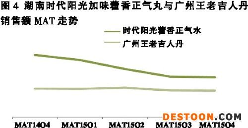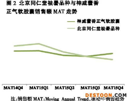 神威藿香正氣軟膠囊:利用終端優(yōu)勢,其在石家莊祛暑市場占據(jù)了半壁江山。但從近年的銷售額MAT走勢來看,兩企業(yè)的祛暑品種在華北地區(qū)均有下滑趨勢,銷售占比同樣為15%。