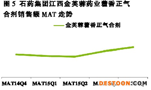 石藥集團江西金芙蓉藥業(yè):在太極藿香正氣口服液的優(yōu)勢終端,石藥集團江西金芙蓉藥業(yè)藿香正氣合劑銷售占2%,得之不易。從金芙蓉藿香正氣合劑銷售額MAT的表現(xiàn)來看,走勢向好。