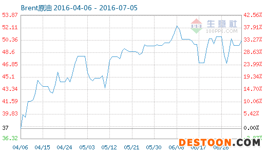 7月5日Brent原油商品指數(shù)為50.00,較昨日下降了0.25點,較周期內(nèi)最高點100.00點(2014-09-09)下降了50.00%,較2016年01月21日最低點27.82點上漲了79.73%。(注:周期指2014-09-09至今)