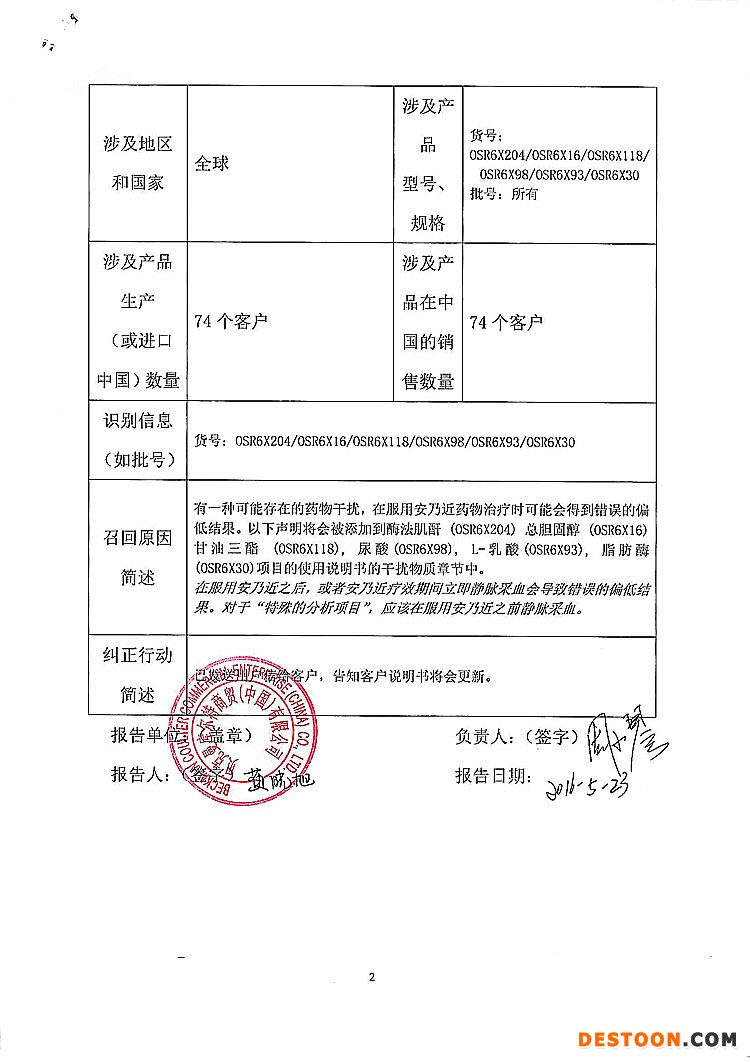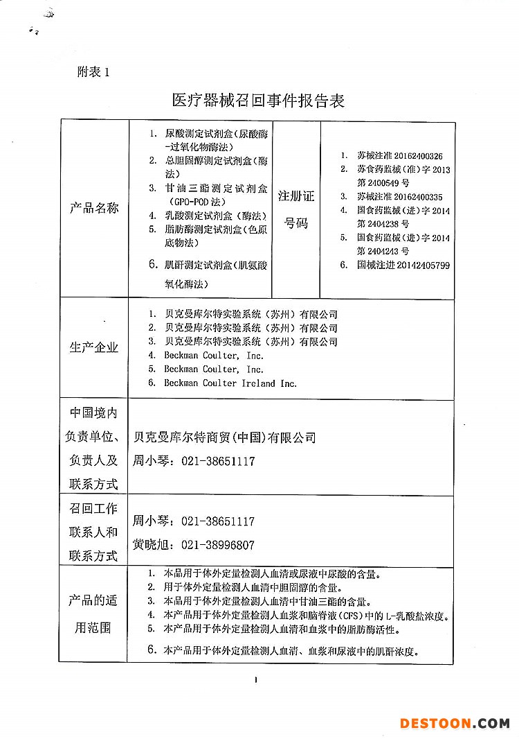 13、貝克曼庫爾特商貿(中國)有限公司對尿酸測定試劑盒、總膽固醇測定試劑盒、甘油三酯測定試劑盒、乳酸測定試劑盒、脂肪酶測定試劑盒、肌酐測定試劑盒主動召回