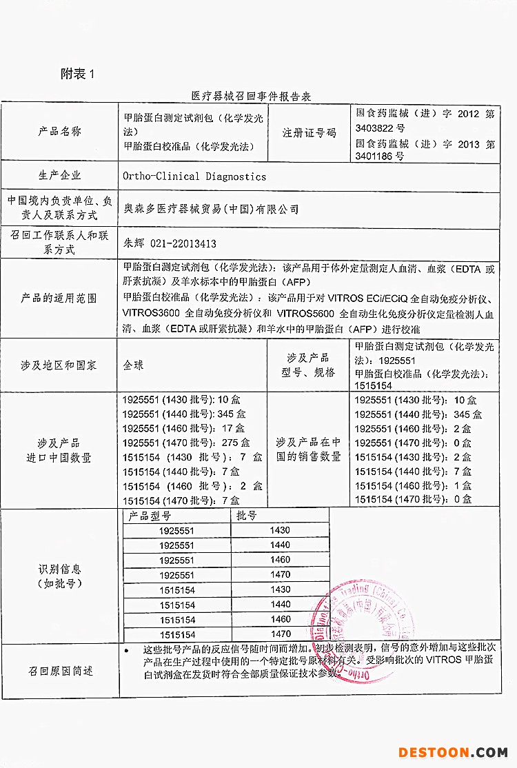 14、奧森多醫(yī)療器械貿易(中國)有限公司對甲胎蛋白測定試劑包(化學發(fā)光法)和甲胎蛋白校準品(化學發(fā)光法)主動召回