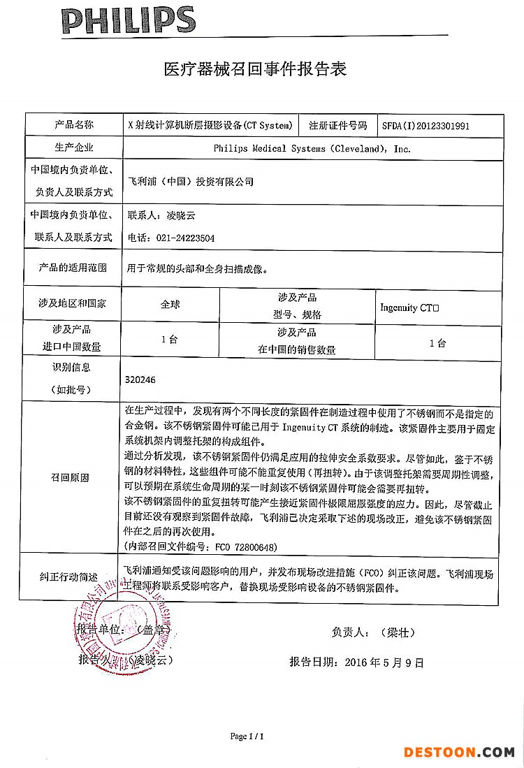 飛利浦(中國)投資有限公司報告:公司發(fā)現(xiàn)有兩個不同長度的緊固件在制造過程中使用了不繡鋼而不是指定的合金鋼,這可能導致故障發(fā)生。公司決定召回相關產(chǎn)品,本次召回級別III級,涉及產(chǎn)品的型號、規(guī)格及批次等詳細信息見《醫(yī)療器械召回事件報告表》。