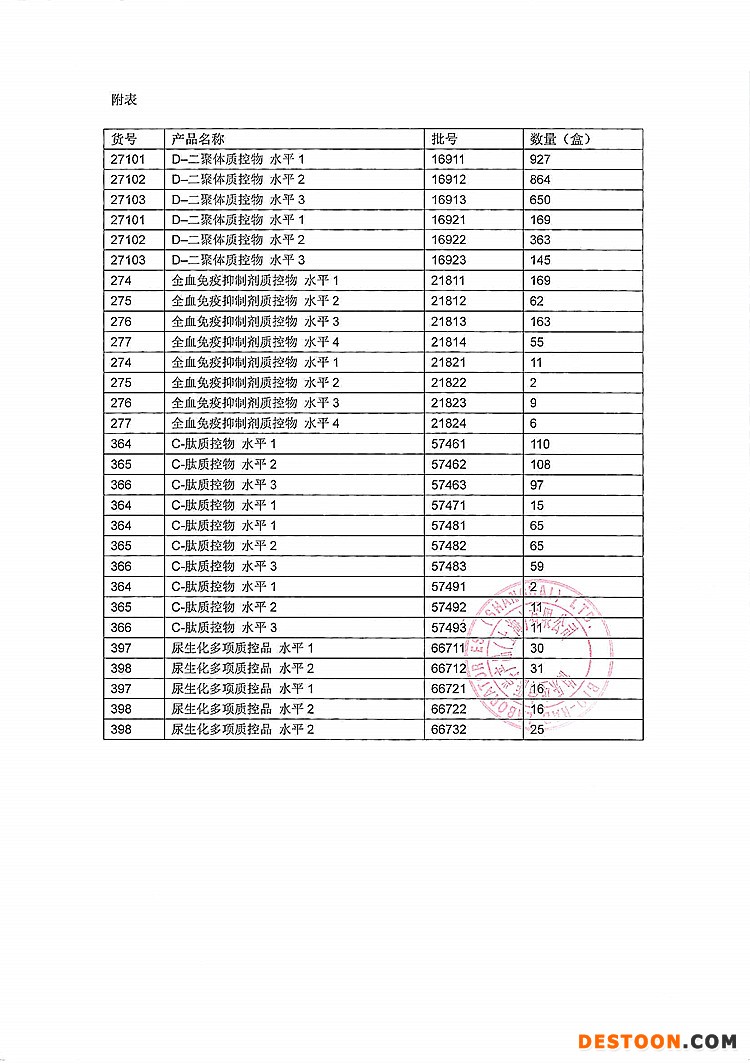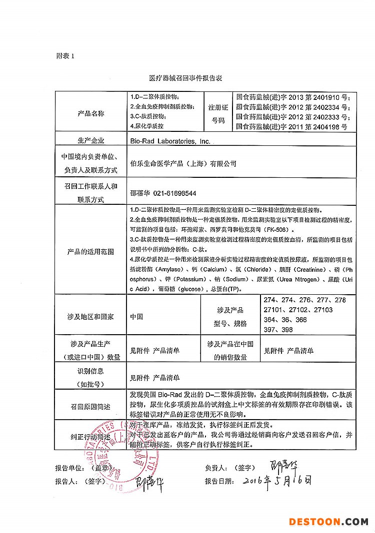 12、伯樂生命醫(yī)學產(chǎn)品(上海)有限公司對D-二聚體質控物、全血免疫抑制劑質控物、C-肽質控物、尿化學質控主動召回