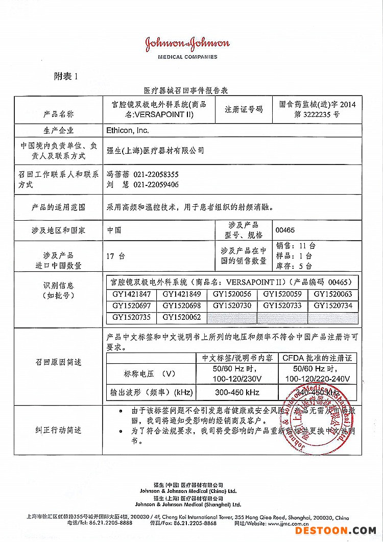 強生(上海)醫(yī)療器材有限公司報告:涉及產(chǎn)品的中文標簽和中文說明書上所列的電壓和頻率不符合中國產(chǎn)品注冊許可證要求。公司決定召回相關產(chǎn)品,本次召回級別III級,涉及產(chǎn)品的型號、規(guī)格及批次等詳細信息見《醫(yī)療器械召回事件報告表》。