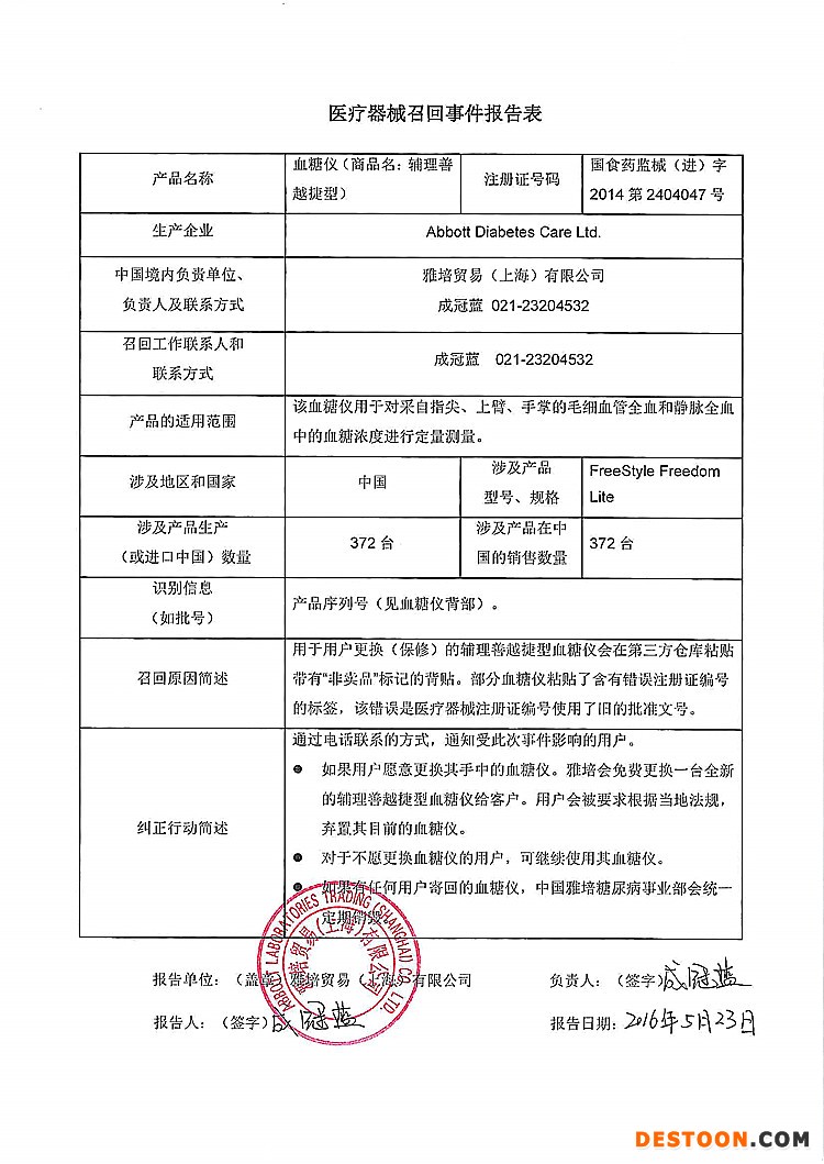 雅培貿易(上海)有限公司報告:企業(yè)發(fā)現(xiàn),部分血糖儀粘貼了含有錯誤注冊證編號的標簽,該錯誤是醫(yī)療器械注冊證編號使用了舊的批準文號。公司決定召回相關產(chǎn)品,本次召回級別III級,涉及產(chǎn)品的型號、規(guī)格及批次等詳細信息見《醫(yī)療器械召回事件報告表》。
