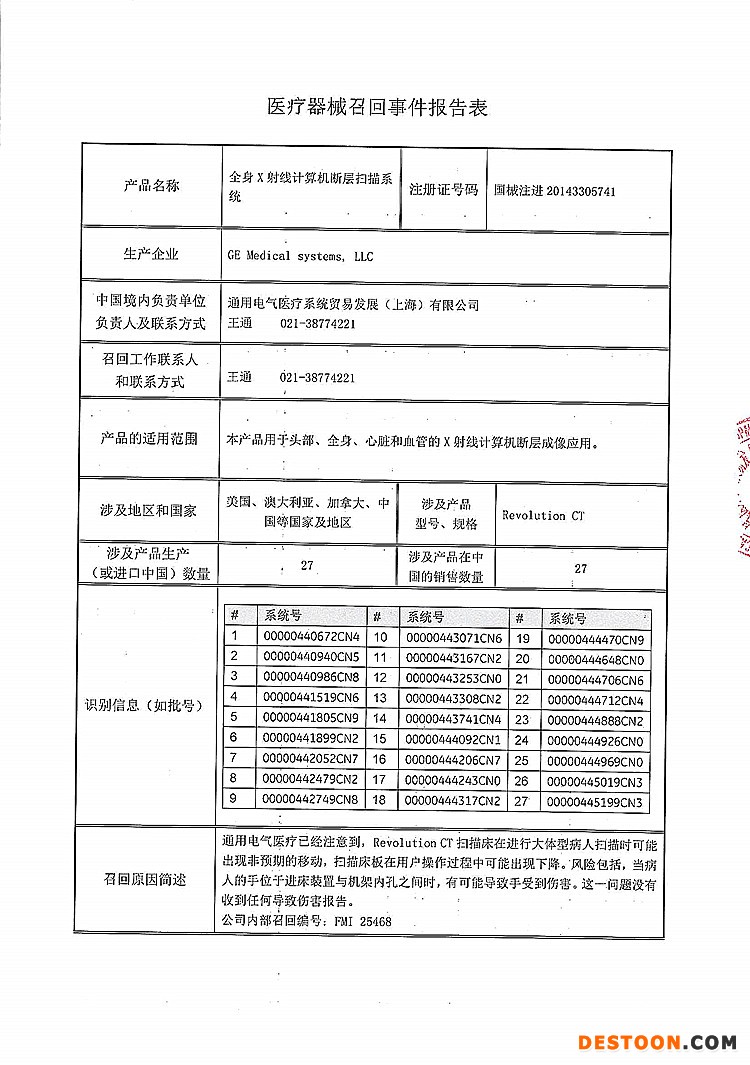 2、通用電氣醫(yī)療系統(tǒng)貿易發(fā)展(上海)有限公司對全身X射線計算機斷層掃描系統(tǒng)主動召回