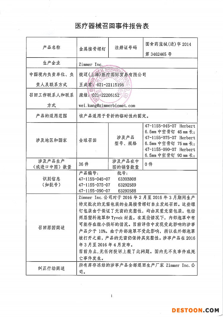 9、捷邁(上海)醫(yī)療國際貿易有限公司對金屬接骨螺釘主動召回