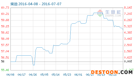 7月7日柴油商品指數(shù)為58.89,與昨日持平,較周期內最高點109.93點(2012-03-30)下降了46.43%,較2016年04月27日最低點55.90點上漲了5.35%。(注:周期指2011-09-01至今)