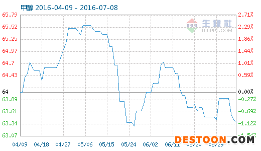7月7日甲醇商品指數(shù)為63.37,較昨日下降了0.07點,較周期內(nèi)最高點127.32點(2013-12-11)下降了50.23%,較2016年01月21日最低點57.93點上漲了9.39%。(注:周期指2011-09-01至今)