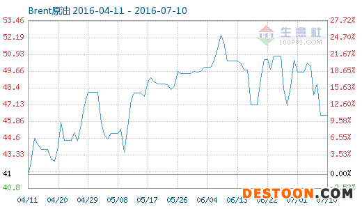 7月10日Brent原油商品指數(shù)為46.31,與昨日持平,較周期內最高點100.00點(2014-09-09)下降了53.69%,較2016年01月21日最低點27.82點上漲了66.46%。(注:周期指2014-09-09至今)