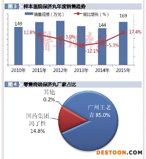 保濟(jì)系列包括保濟(jì)丸和保濟(jì)口服液,該產(chǎn)品屬于經(jīng)典方劑,在民間曾有“北有六神丸、南有保濟(jì)丸”的說法,其主要銷售陣地在零售市場,在醫(yī)院中成藥市場,楓蓼腸胃康系列占了腸道用藥近四成市場,而厚樸排氣合劑隨后,也有18.22%的比重,保濟(jì)丸占了腸道用藥中成藥的0.7%。而在零售市場,保濟(jì)丸占助消化類2.6%的比重。與藿香系列產(chǎn)品有所不同,主要側(cè)重在傷食(如吃太多、吃太雜、太油膩、不干凈等)引起的腸胃不適、拉肚子,以促進(jìn)消化、化滯消食等功效。2010-2015年零售終端年復(fù)合增長率為2.3%。從歷年的年度走勢來看,2013年有所滑落外,隨之緩慢上揚(yáng),2015年表現(xiàn)出色,是近5年內(nèi)同比增幅最大,達(dá)17.4%。該產(chǎn)品價(jià)格相對親民,競爭廠家不多,廣州王老吉藥業(yè)的兩個(gè)劑型壟斷近八成市場,國藥集團(tuán)馮了性藥業(yè)也瓜分了14.8%的市場,其他廠家如廣東華天寶、廣東羅浮山白鶴制藥等份額較少(見圖3、圖4)。