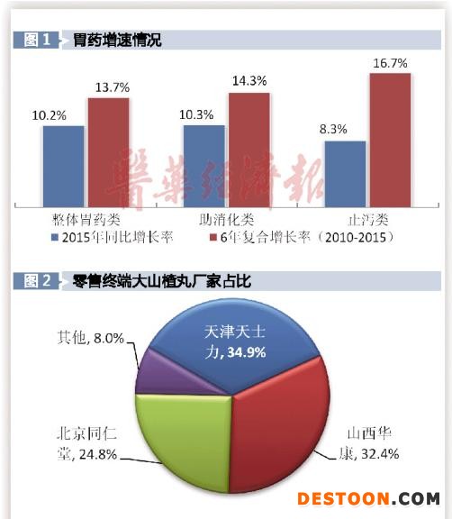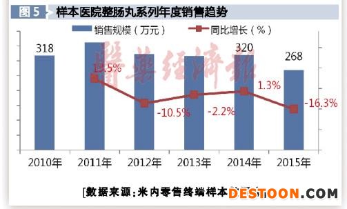 腸炎寧系列有丸劑、口服液、片劑、顆粒劑、膠囊劑等多種劑型,其中天施康的腸炎寧片通過近年有效的廣告推廣、終端店員推薦等手段迅速拉升銷售,成為該品種中銷售最好的劑型。而海南葫蘆娃制藥的腸炎寧膠囊2015年增速較快,也表現(xiàn)較好。丁桂兒臍貼屬于精準(zhǔn)細(xì)化市場,針對父母怕孩子吃藥副作用大的心理,也闖出了一片較好市場前景,2010-2015年的年復(fù)合增長率高達(dá)23.4%。