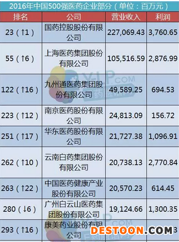 中國(guó)醫(yī)藥化工網(wǎng)訊 2016年財(cái)富中國(guó)企業(yè)500強(qiáng)榜單出爐,共有18家醫(yī)藥企業(yè)上榜,國(guó)藥控股以2270億元居首。