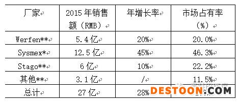 目前,中國(guó)的血凝市場(chǎng)容量大約為27億元,外資企業(yè)在該領(lǐng)域具有絕對(duì)優(yōu)勢(shì),預(yù)計(jì)占有其中90%以上的市場(chǎng)份額。相對(duì)于免疫的ARDS四大巨頭,血凝是WSS三大巨頭,分別為美國(guó)國(guó)家儀器實(shí)驗(yàn)室(IL,Werfen集團(tuán))、日本希森美康(Sysmex集團(tuán))、法國(guó)思塔高(Stago集團(tuán)),其他外資企業(yè),如日本積水、德國(guó)BE等具有一小部分的市場(chǎng)份額。國(guó)內(nèi)企業(yè)市場(chǎng)份額較少,塞克希德,普利生(邁瑞集團(tuán)成員)及上海太陽(yáng)為其中的佼佼者。下面我們簡(jiǎn)單介紹一下該市場(chǎng)的主要玩家和未來(lái)發(fā)展方向。